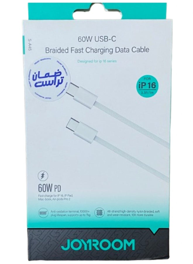 كابل Joyroom S-A45 Braided Series USB-C to USB-C هو الحل المثالي للشحن السريع ونقل البيانات بكفاءة عالية، مصمم بخامات قوية ومقاومة للتلف مع دعم أحدث تقنيات الشحن.