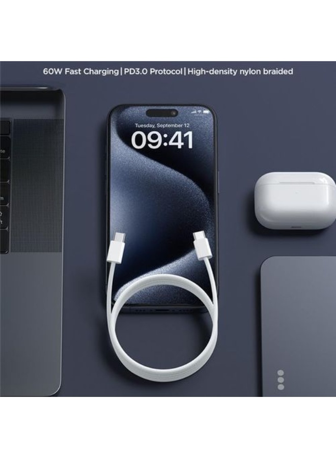 يأتي بتصميم مجدول (Braided) عالي الجودة لتحمّل الاستخدام اليومي المكثف ومنع القطع أو التلف، مع أطراف USB-C من الجانبين، مما يجعله متوافقًا مع جميع الأجهزة التي تدعم منفذ Type-C.